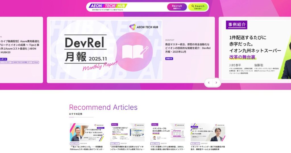 | AEON TECH HUB | 採用・認知変容 | エンジニア・開発者 | 技術的透明性と現場のリアルな発信 |